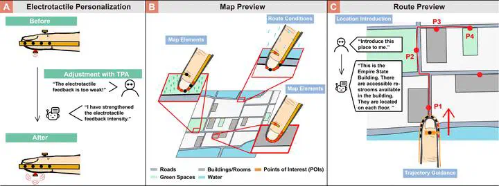 Previewing routes to unfamiliar destinations is a crucial task for many blind and low vision (BLV) individuals to ensure safety and confidence before their journey. While prior work has primarily supported navigation during travel, less research has focused on how best to assist BLV people in previewing routes on a map. We designed a novel electrotactile system around the fingertip and the Trip Preview Assistant (TPA) to convey map elements, route conditions, and trajectories. TPA harnesses large language models (LLMs) to dynamically control and personalize electrotactile feedback, enhancing the interpretability of complex spatial map data for BLV users. In a user study with twelve BLV participants, our system demonstrated improvements in efficiency and user experience for previewing maps and routes. This work contributes to advancing the accessibility of visual map information for BLV users when previewing trips.