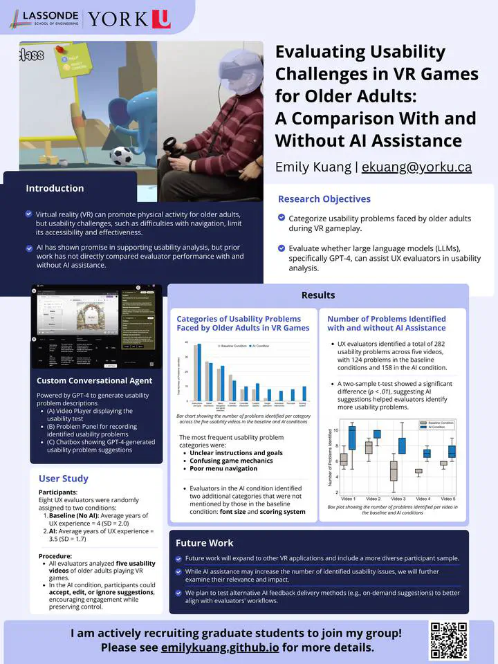 Evaluating VR usability presents unique challenges, particularly when designing for older adults. This study explores how AI-generated suggestions might support UX evaluators in identifying usability problems in VR games. Eight evaluators reviewed videos of older adults interacting with a VR game under two conditions: with and without AI assistance. Older adults commonly encountered problems related to unclear instructions, confusing game mechanics, and poor menu navigation. Evaluators in the AI condition identified more usability issues overall, including additional categories such as font size and scoring confusion. While preliminary, these findings suggest that AI tools may help expand evaluators’ perspectives, especially in contexts where they lack relevant lived experience.